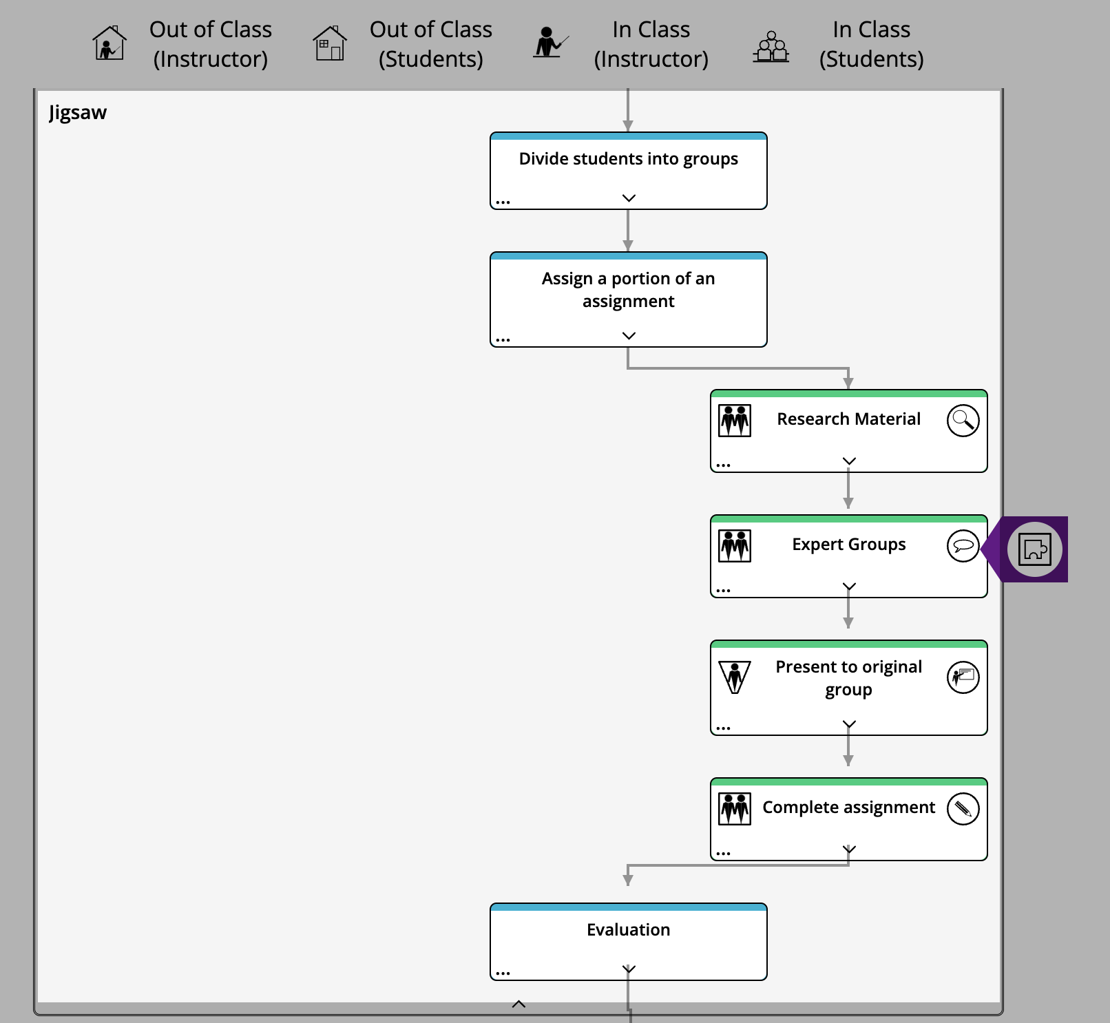 - Out of Class (Students) node: represents tasks students are expected to do in preparation for a class or after a class.